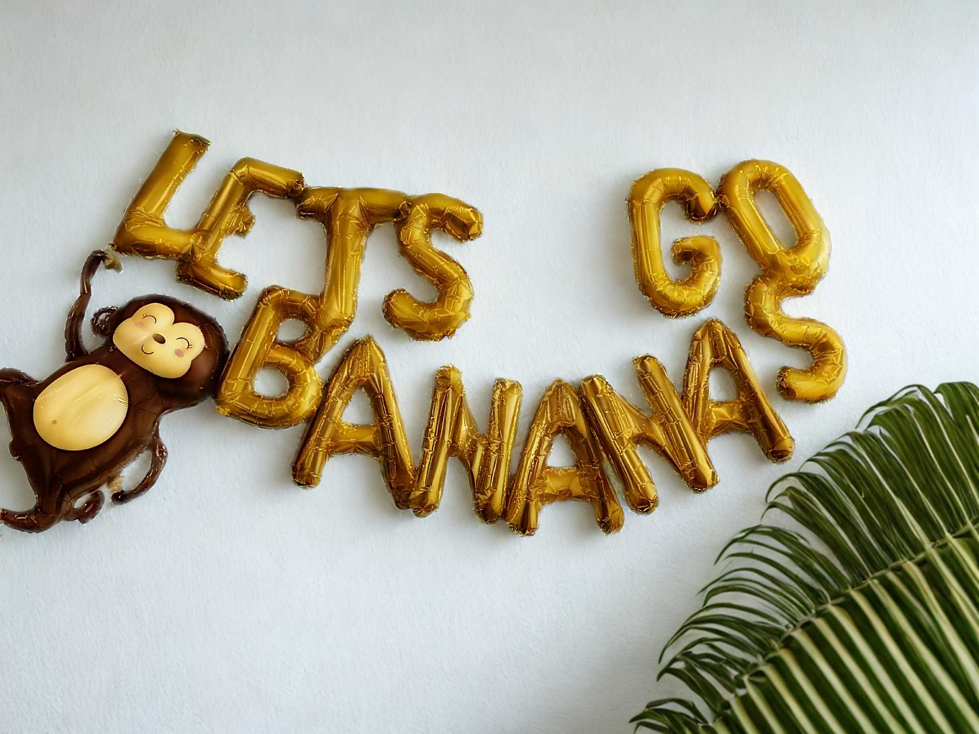 - Wall Decor - "Lets Go Bananas" mylar balloon banner, green fringe backdrop